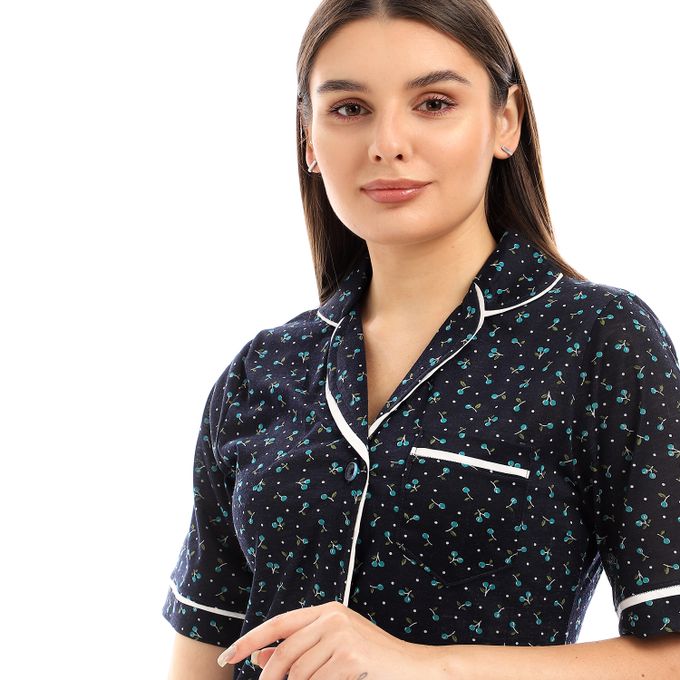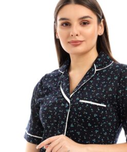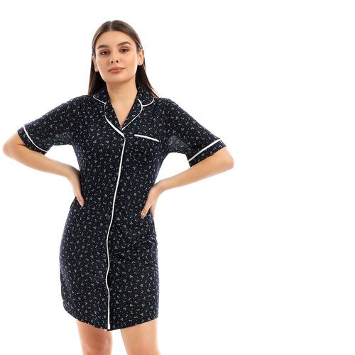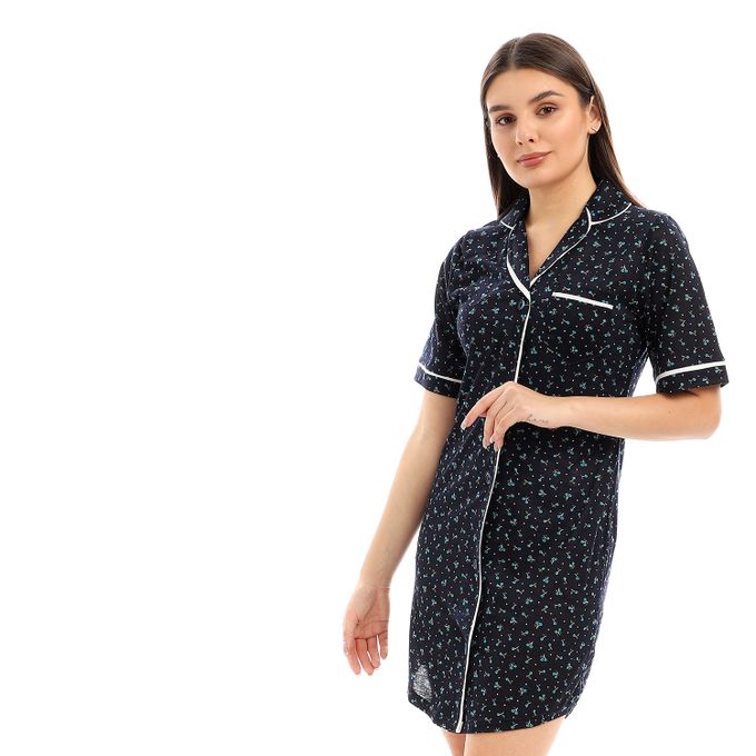 Andora Floral Classic Collar Buttoned Sleepshirt – Navy Blue